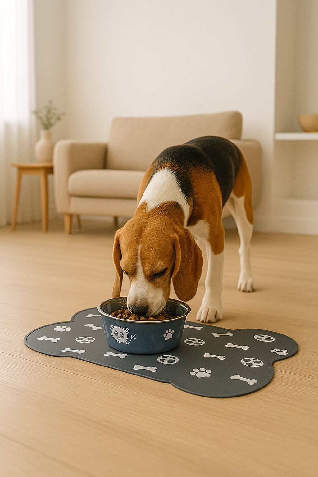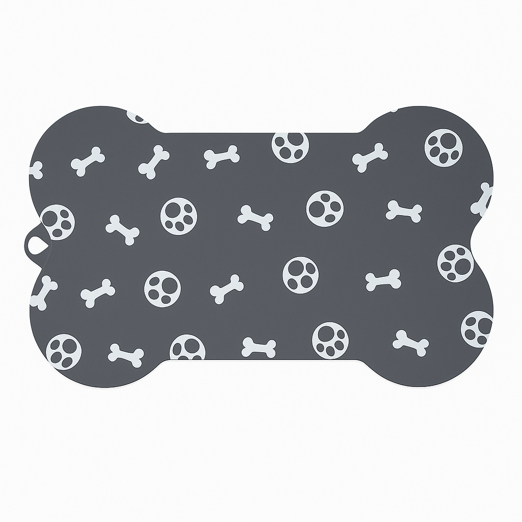 Un tapete resistente, práctico y súper fácil de limpiar, ideal para mantener el área de alimentación de tu mascota ordenada y libre de derrames. Su diseño en forma de huesito y estampado de huellas le da un toque divertido y moderno.
